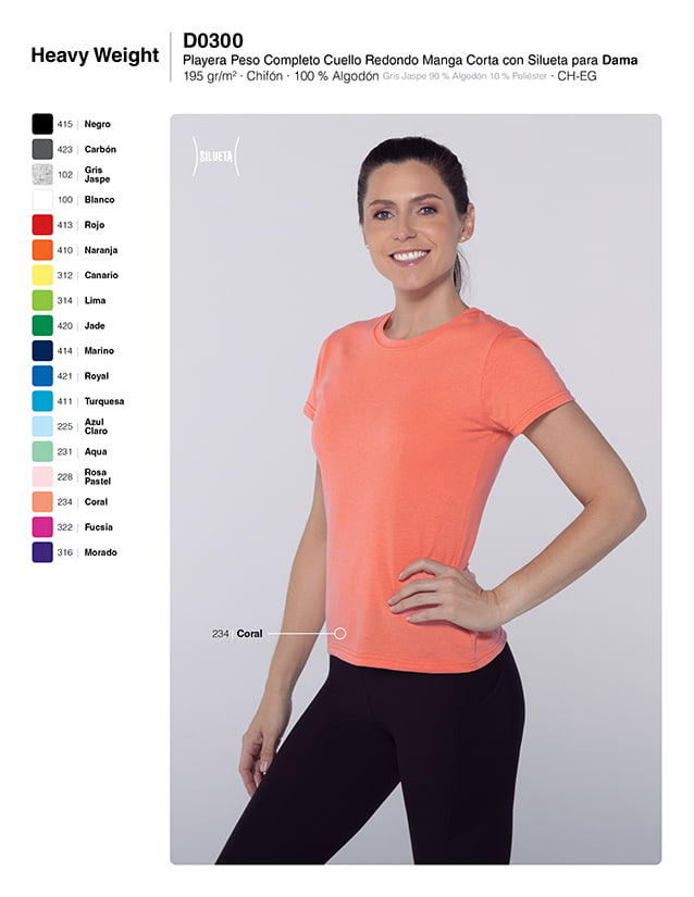D0300 Playera Peso Completo Cuello Redondo Manga Corta con Silueta para Dama